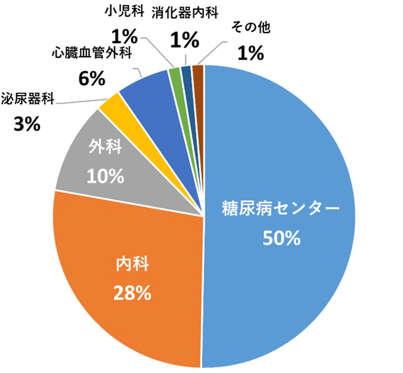 栄養指導においては、糖尿病センター(糖尿病)からの依頼が全体の50%を占めています。次いで、内科(脂質異常症や高血圧症等)、外科(手術前後)の順となっております。